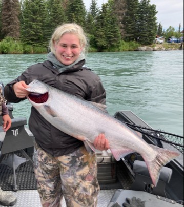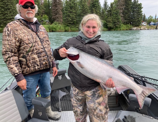 First day of catch and keep any size king salmon on the Kenai River today was tough fishing, I only saw 3 king salmon caught and I was bite less so went to trolling some small plugs on my trout rods for some action and managed to hook up this young lady from Iowa on a nice 25 lb king as well as some rainbow trout.